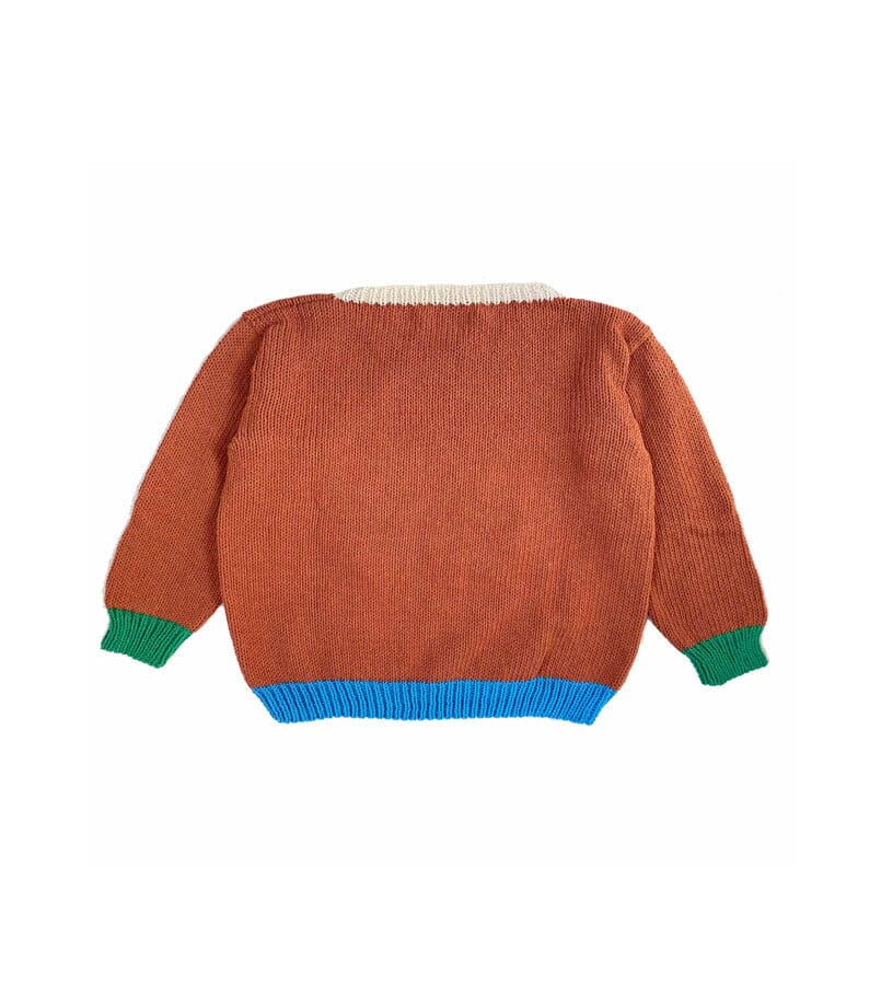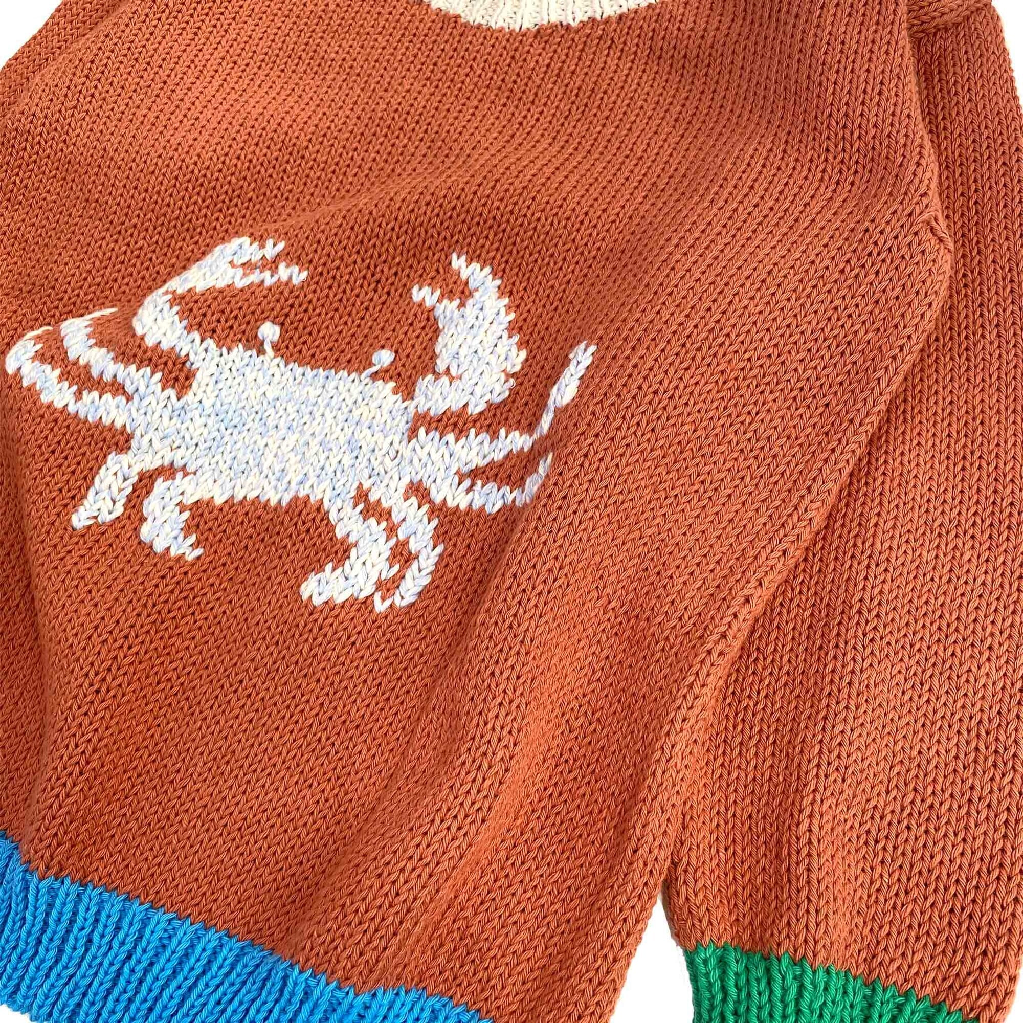 Handknitted cotton sweater, with jaquard crab at front.