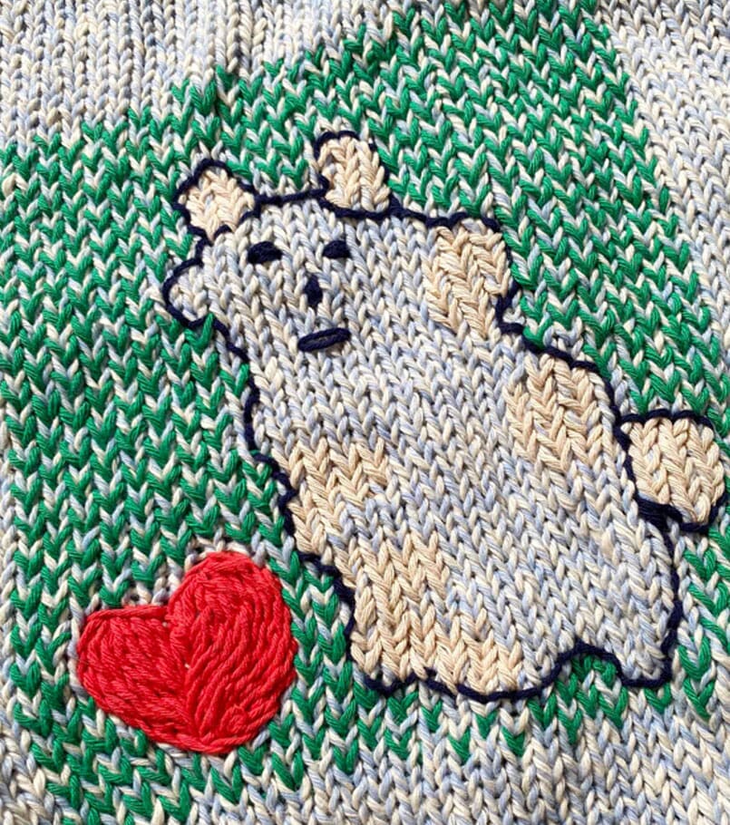 Handknitted cotton vest with embroidery details. Collab with Daon a little artist, that created this artwork of their family dog Jessie.